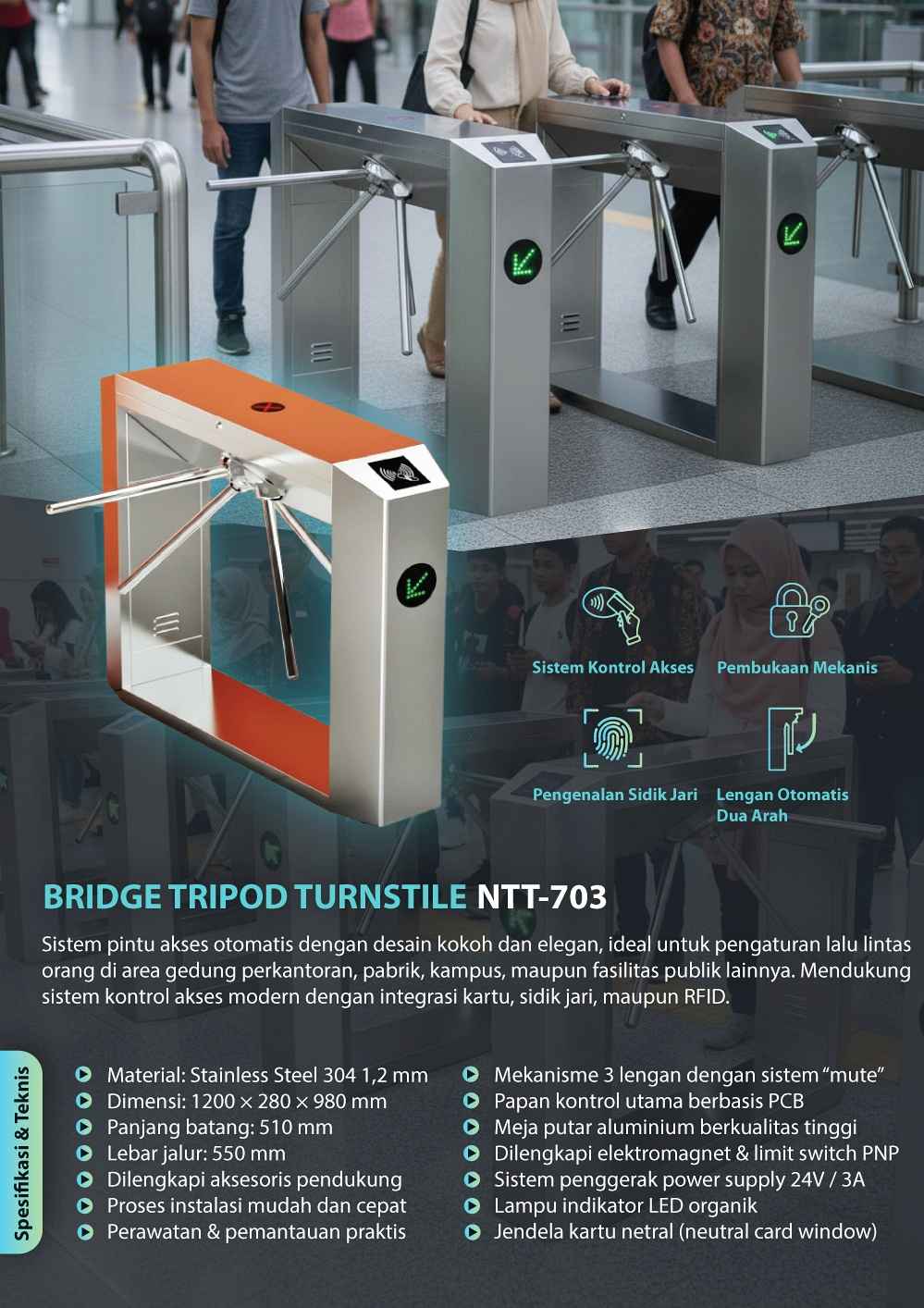 ini dapat diintegrasikan dengan pembaca kartu RFID, fingerprint, hingga face recognition.tripod turnstile otomatis Material Stainless Steel Premium: Body